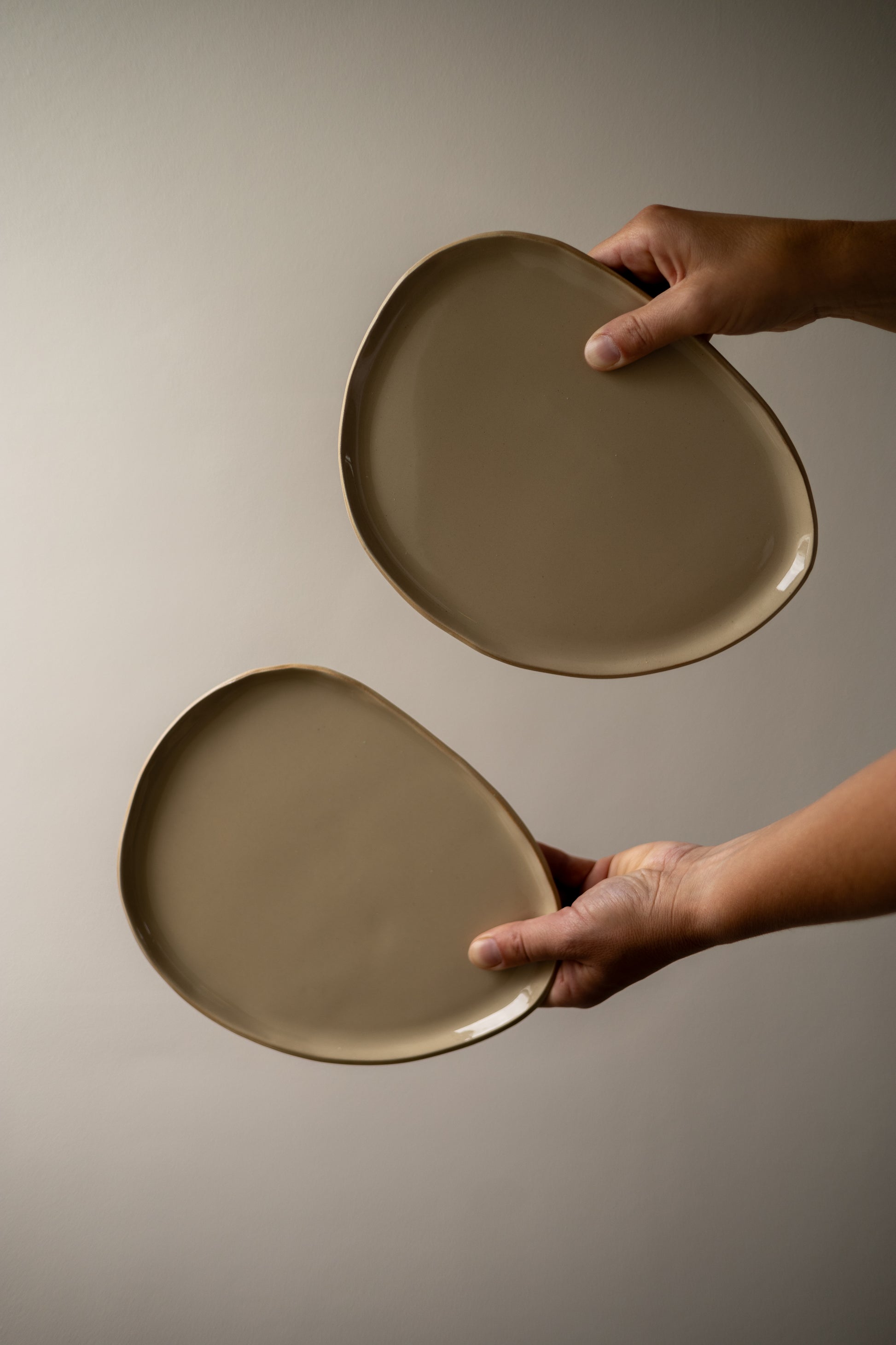 Met de hand gevormd uit platen klei en steengoed gebakken op 1240 graden. Daardoor is elk bord sterk en duurzaam. De transparante glazuurlaag benadrukt de speelse, warme en neutrale uitstraling die deze collectie kenmerkt.